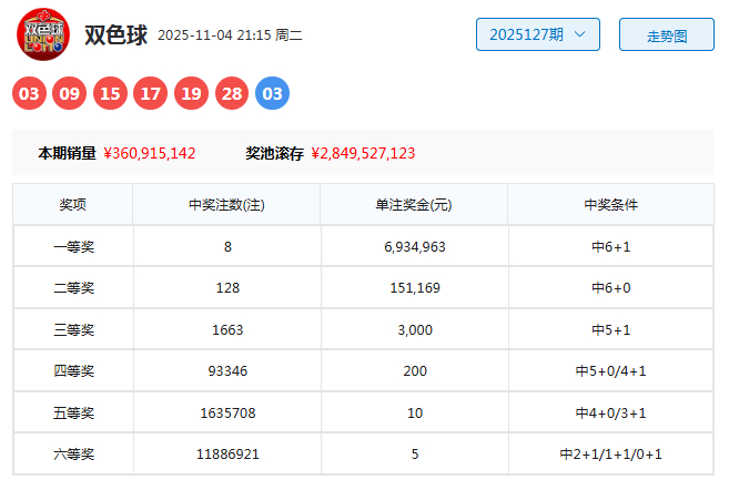 发布日期:2025-11-07 08:17 点击次数:193双色球25124期开奖,红球03 09 15 17 19 28,蓝球03。当期红球号码大小比为3:3,三区比为2:3:1,奇偶比为5:1。形式方面,红球开出1枚重号19;1组同尾号09和19;斜连号03、15、17;蓝球开出遗漏8期的奇数03