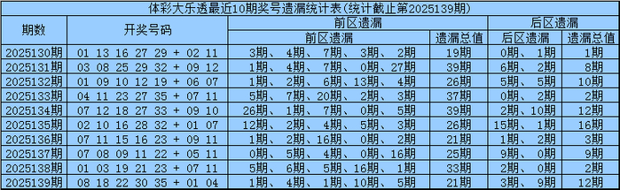 凡哥体彩大乐透第2025140期前区五区遗漏分析:(界说:遗漏0-3期号码为热码,遗漏4-9期号码为温码,遗漏10期及10期以上号码为冷码)