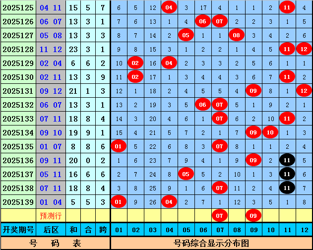 后区奖号分析:上期后区奖号为01+04,遗漏期数为3期和9期,当今后区号码01-12分别遗漏:0期、9期、26期、0期、2期、7期、1期、12期、3期、5期、1期、8期,本期后区小心号码05、07、09、10、11,两码温煦07、09。