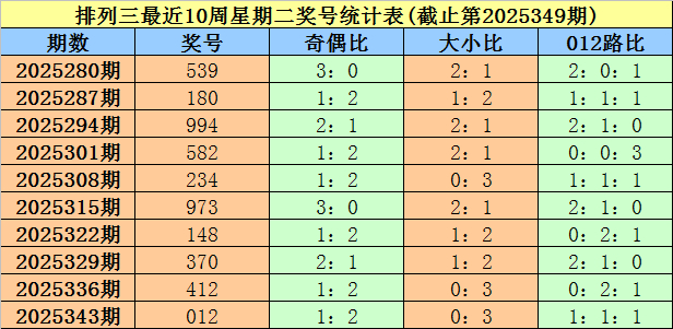 陈列三第2025343期(上周星期二)奖号为012。其中奖号奇偶比为1:2,大小比为0:3,012路比为1:1:1。