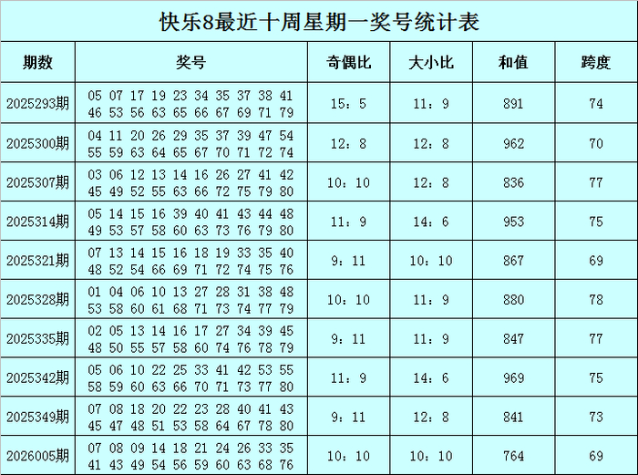 福彩欢畅8第2026005期(上周一)开奖转头:07 08 09 14 18 21 24 26 33 35 41 43 49 54 56 59 60 63 68 76,其中奖号和值为764,跨度为69,奇偶比为10:10,大小比为10:10。